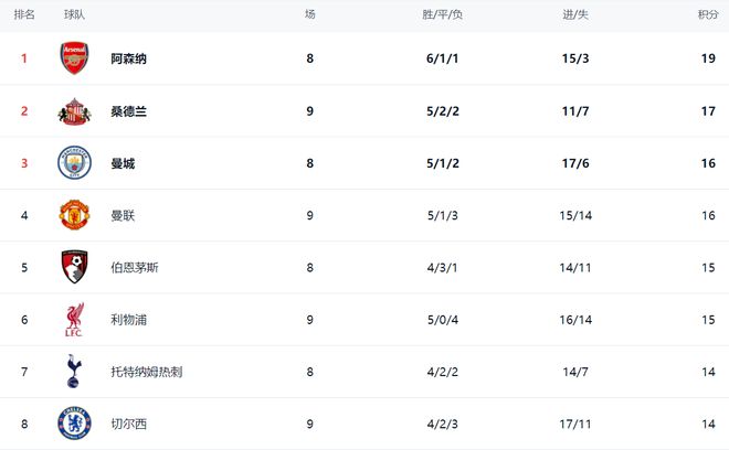 英超第9轮进行了多场比赛,爆出了一些冷门。切尔西在主场爆冷,以1-2输给了桑德兰。这场比赛切尔西的进球来得非常快。在第4分钟加纳乔就进球帮助切尔西取得领先。但是,在第22分钟切尔西就被扳平了。伊西多尔在门前混战中把球打进。之后双方长时间没能进球。直到补时阶段,塔勒比站了出来,打进绝杀进球。最终切尔西在主场丢掉了3分,真是不敢相信。切尔西各项赛事4连胜就此终结。利物浦也爆出了大冷门,在客场输给了布伦特福德。这场比赛开场5分钟利物浦就丢球了。瓦塔拉在禁区内凌空射门打进。沙德在第45分钟单刀低射破门,扩大比分。随后凯尔凯兹抢点破门,为利物浦扳回一球。但在下半场,范戴克犯规送点。蒂亚戈主罚命中,再次扩大比分。最后阶段萨拉赫抽射破门,差距再次缩小到1球。但是,时间所剩无几,利物浦没能再进球。最终利物浦2-3输掉了比赛,英超遭遇4连败。另一支豪门球队曼联则在主场取得了胜利,以4-2击败了布莱顿。这场比赛库尼亚兜射破门,帮助曼联取得领先。之后卡塞米罗远射打进,扩大比分。下半场姆伯莫低射破门,让曼联的领先优势扩大到3球。维尔贝克依靠任意球机会扳回一球。最后阶段科斯图拉斯头球顶进,让布莱顿看到扳平比分的希望。但是,很快姆伯莫就用进球帮助曼联锁定了胜局。曼联取得一波3连胜。在积分榜上,阿森纳以19分高居榜首。桑德兰这匹大黑马升到了第2名,总积分是17分。第3的是曼城,拿到16分。曼城比桑德兰少踢1场。曼联赢球之后,排名升到了第4,积分和曼城相同。而利物浦依然是15个积分,掉到了第5名。伯恩茅斯以15分排名第6。第7的是热刺,拿到14分。切尔西也是14分,排名第8。