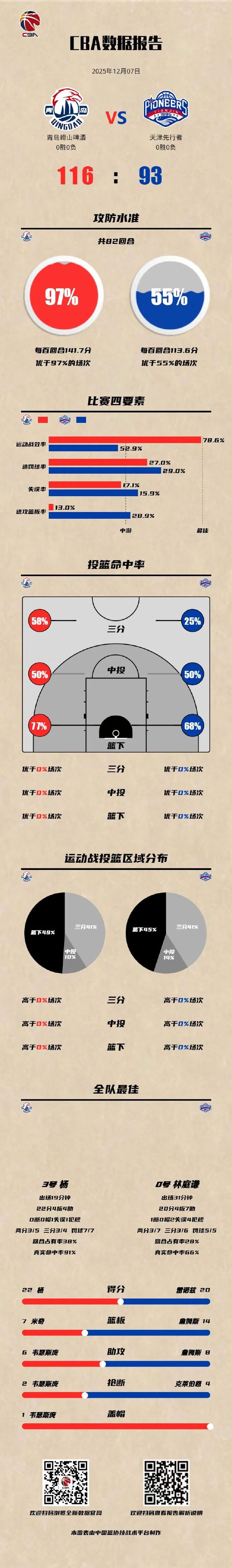 CBA俱乐部杯赛北京时间2025年12月7日,第二届中国人寿·CBA俱乐部杯小组赛继续,青岛崂山啤酒迎战天津先行者。球队整体发挥出色,开局建立领先优势并保持到最后,五人得分上双,最终116-93战胜对手。12月8日下午15:00,小组赛收官之战,青岛崂山啤酒将迎战山东山高,球迷朋友可以通过咪咕视频观看比赛直播,一起为球队加油助威!CBA俱乐部杯赛首发名单韦瑟斯庞、赵嘉义、王睿泽、纪卓、米奇球员数据约瑟夫·杨22分4篮板4助攻韦瑟斯庞19分3篮板6助攻2抢断米奇16分7篮板汤普森14分6篮板3助攻吕俊虎12分数据分析