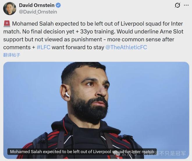 3、几个小时前,网媒竞技(TA)利物浦跟队记者皮尔斯撰文透露:--与利兹联赛后第二天(上周日),萨拉赫照常出现在利物浦训练中心,他与那些没有参加与利兹联比赛的队友一起,参加了一堂在室内进行的轻度训练课。--有一种感觉是,利物浦希望尽快平息此事,但一些重大决定已迫在眉睫。最首当其冲的,就是是否将萨拉赫列入下一场出征国米的阵容当中。--利物浦今天(周一)的日程是,球员当地时间11点45(北京时间19点45)开始训练,然后飞往意大利。斯洛特将在英国时间18点45(北京时间周二凌晨2点45)在圣西罗进行例行的赛前发布会。无论萨拉赫是否出征,这场发布会的主题都已经毫无悬念。--萨拉赫在上周日赛后通过媒体“开炮”之后,与身在迪拜的经纪人阿巴斯进行了“深度”沟通。--利物浦高层对于萨拉赫的行为并不感到十分意外,但萨拉赫炮轰俱乐部和斯洛特的言辞严重程度超出预期。利物浦高层知道,萨拉赫被弃用的比赛越多,他“开炮”的可能性就越大,对于他认为不公平的事,他从不会保持沉默。--一些队友对萨拉赫的行为已经有心理准备,因为他们已经注意到萨拉赫在比赛前一天得知无法首发后的情绪变化,他们知道萨拉赫会爆发,所以他们对此并不意外。虽然萨拉赫希望得到尊重,但他在利物浦更衣室里几乎没有亲近的朋友。--实际上,萨拉赫的行为将外界的关注焦点从球队表现转移到他个人身上,突然没人再谈论科纳特那些失误了。--萨拉赫此举对球队会有什么影响?一位利物浦主力球员的经纪人表示:“说实话,影响不大。考虑到萨拉赫为俱乐部的贡献,没人可以对萨拉赫指手画脚。”--尽管出现萨拉赫事件和最近战绩不佳,芬威集团依然完全信任斯洛特。如果萨拉赫“开炮”的目的是让斯洛特保证自己的首发位置,那他要失望了。因为球员挑战主帅的首发选择而解雇主帅是不可想象的,无论这个球员曾经多么伟大。--俱乐部将萨拉赫最近连续替补视为临时安排,并非从此永远失去首发位置。俱乐部认为,尽管连续三场没首发,但这依然仅仅是斯洛特根据球队利益做出的阵容安排,幕后没有人想要赶走萨拉赫。--俱乐部内容认为,最近三场萨拉赫没首发的比赛,利物浦1胜2平,这种改变是有效果的,利物浦让对方创造的得分机会更少了。--斯洛特也是为萨拉赫离队参加非洲杯做准备,在他走之前提前尝试应对计划。--还有不少人同情斯洛特,因为在解释萨拉赫不首发时,他一直为萨拉赫说话。对桑德兰赛前,斯洛特说:“萨拉赫这么多年在利物浦一直很杰出,未来也会和我们在一起。他当然会不高兴,但他表现得非常职业,非常支持队友,举止十分得体。”--短期内,非洲杯让萨拉赫事件暂时远离利物浦,这给了各方一个冷静下来重新审视问题的机会。但这段时间能否足够抚平伤痕,则要另当别论。--如果萨拉赫寻求在非洲杯后离开利物浦,沙特和美国大联盟兴趣十足。