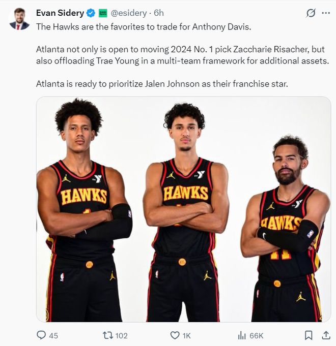 随后NBA记者埃文-斯迪瑞跟踪报道,老鹰队已经确立了杰伦-约翰逊未来的核心地位,2024年状元郎里萨谢已经被摆上货架,除此之外老鹰管理层还在探索交易特雷杨,老鹰希望通过多方交易送走吹杨以换取更多的未来资产。