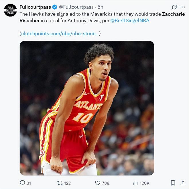 独行侠媒体认为一个里萨谢根本无法满足球队,他们希望老鹰送出亚历山大-沃克、奥孔古、里萨谢、2026年老鹰首轮、2027年雄鹿首轮来换浓眉,也就是5换1,可这个方案老鹰管理层能认可吗?