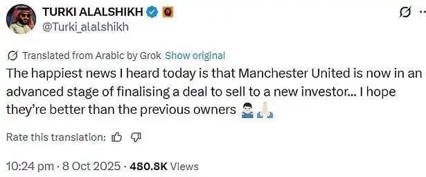 英超豪门曼联,又一次被推上了风口浪尖,这一次不是主帅阿莫林又创下什么耻辱纪录,而是红魔有可能又易主!来自英国《镜报》的最新爆料称:格雷泽家族已经开始考虑出售他们在曼联的股份,一旦收到超过50亿英镑的报价,他们将正式放手。而据最新市场估值,曼联目前的市值大约在20亿英镑左右,格雷泽家族这一波操作真的有点让人看不懂啊,如果真的成功的话,肯定是英超史上,一个商业神话的里程碑!这次传闻的核心人物,是沙特娱乐局局长、亿万富翁图尔基·谢赫。他在社交媒体上罕见发文,暗示自己即将完成对曼联的收购交易,并表示:“我希望新的老板能比之前的更好。”这一句话,引爆了整个欧洲足球圈。《镜报》随即跟进确认——图尔基·谢赫确实是潜在买家之一,且正在评估出价。如果报价达到52亿英镑,将足以说服格雷泽家族点头。值得一提的是,这并非曼联第一次被中东资本盯上。早在2024年,卡塔尔财团谢赫·贾西姆就提出全资收购曼联的计划,报价高达60亿英镑,但最终被格雷泽拒绝。相反,他们选择将27.7%的股份出售给英国石化巨头英力士集团老板拉特克利夫爵士,后者支付了12.5亿英镑,并获得了俱乐部的足球运营控制权。2005年,当时的格雷泽家族以7.9亿英镑收购曼联,成为英超第一支被美资完全掌控的豪门。收购完成后,格雷泽将债务转嫁给俱乐部,每年巨额利息让曼联背上沉重包袱。球迷怒骂“吸血鬼”,但从纯商业角度来看,这笔买卖堪称教科书式的投资成功。在这20年间,曼联的品牌影响力和商业收入持续增长。尽管球队在弗格森退役后战绩大幅下滑,但红魔依旧是全球最赚钱的俱乐部之一。仅赞助收入和转播分成,就足以支撑曼联成为市值最高的英超俱乐部。为何格雷泽家族选择在这个节点考虑出售球队呢?据《镜报》报道,曼联目前正在推动一项耗资20亿英镑的新球场计划:打造一座可容纳10万名球迷的现代化球场,以替代老旧的老特拉福德。然而,这项庞大的计划迟迟无法获得足够资金支持。格雷泽原本希望引入外部资本完成融资,但英国国内资本兴趣不大,美国投资机构又担心回报周期过长。这时,来自中东的资金成为最现实的选择。有消息称,格雷泽正在考虑出售他们持有的48.9%股份的一部分,以换取沙特方面的巨额投资,确保球场建设计划顺利推进。这种“部分出售+资金入股”的模式,既能保留家族控制权,又能获得现金流,是他们当前最可能的路线。球迷多次发起抗议,甚至冲进老特拉福德要求格雷泽“滚出曼联”。他们认为,这个美国家族只把俱乐部当成印钞机,而非一支荣耀球队。如果收购完成,曼联将成为继纽卡斯尔之后,又一家被中东资本掌控的英超豪门。这不仅意味着资金充裕,更可能带来全新的运营思路。沙特的娱乐局早已在体育领域投入巨资,从F1到高尔夫,再到足球联赛,意图打造“体育强国”。曼联如果被纳入这一体系,意味着他们将拥有巨额转会预算和全球化推广资源。目前,格雷泽家族拒绝对此事发表评论,而拉特克利夫爵士也坚称自己“完全致力于曼联项目”。但知情人士透露,格雷泽与潜在投资方的接触仍在秘密进行,他们甚至无需向其他股东提前通报即可展开谈判。