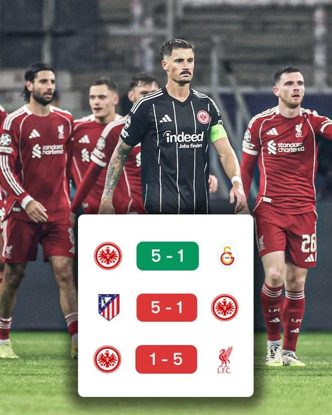欧冠联赛阶段第三轮,法兰克福主场1-5不敌利物浦,至此,法兰克福本赛季欧冠三场比赛的比分都是5-1。本赛季欧冠联赛阶段首轮比赛,法兰克福在主场5-1大胜加拉塔萨雷。随后两轮欧冠比赛中,法兰克福以同样1-5的比分输给了马德里竞技和利物浦。欧冠联赛阶段前三轮战罢,法兰克福目前以1胜2负积3分的成绩排名第22位。【上咪咕独家看英超】