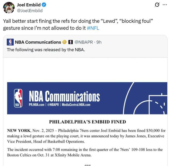 结果恩比德依旧不服,直接转发NBA的处罚报告,正面回怼道:“你们最好对裁判做出的那种下流阻挡犯规动作做出处罚,毕竟我没有被允许做这一动作。”恩比德所提及的裁判“阻挡犯规”动作为双手叉腰,虎口置于髋部两侧,与恩比德做出的下流动作的确有些类似,但暗指的意义明显不同。