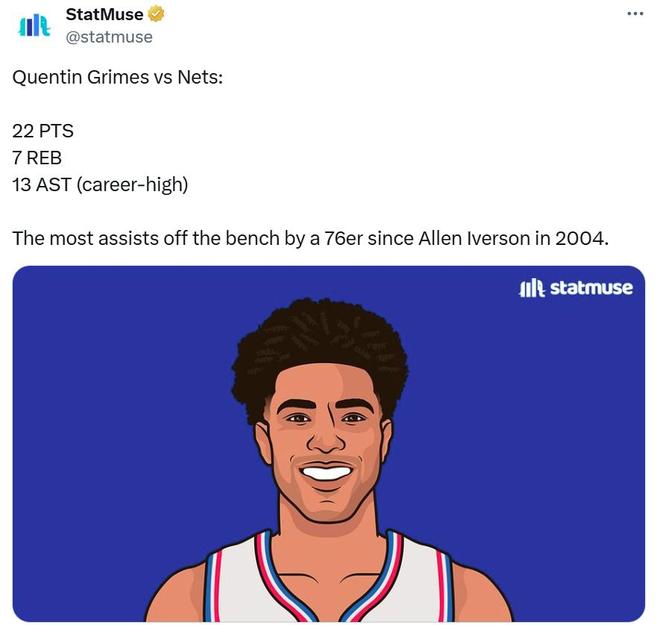 奇兵生涯之夜在后场双核发威的同时,奇兵格莱姆斯也持续蜕变,13中7拿下22分7篮板13助攻1抢断1盖帽。不仅交出+32全场最高正负值,还送出13次助攻展现多面手风采,其中单场13次助攻创造格莱姆斯生涯新高。凭借这样的表现,格莱姆斯成为04年艾弗森后,76人队史首位以替补身份做到这点的球员。