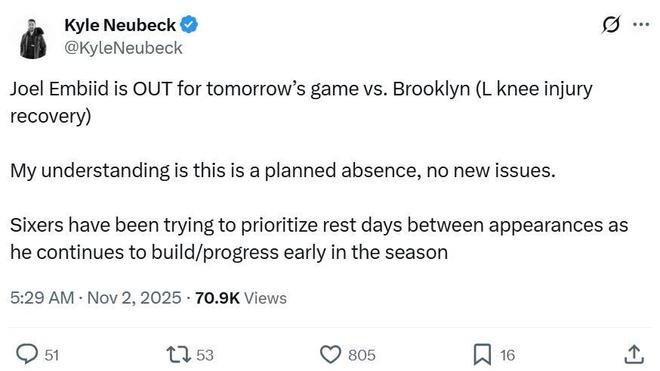 恩比德被罚5万本场比赛开始前,76人队记Kyle Neubeck曝出恩比德因为左膝伤病管理缺席本场比赛,同时专门强调恩比德伤病没有出现新的状况,本场缺席本就在计划之中。恩比德缺席也并不让人意外,在连续遭遇严重膝伤困扰后,恩比德能够回归赛场本身就已经十分不易,上一场对阵凯尔特人赛后恩比德也公开承认自己感到疲惫。