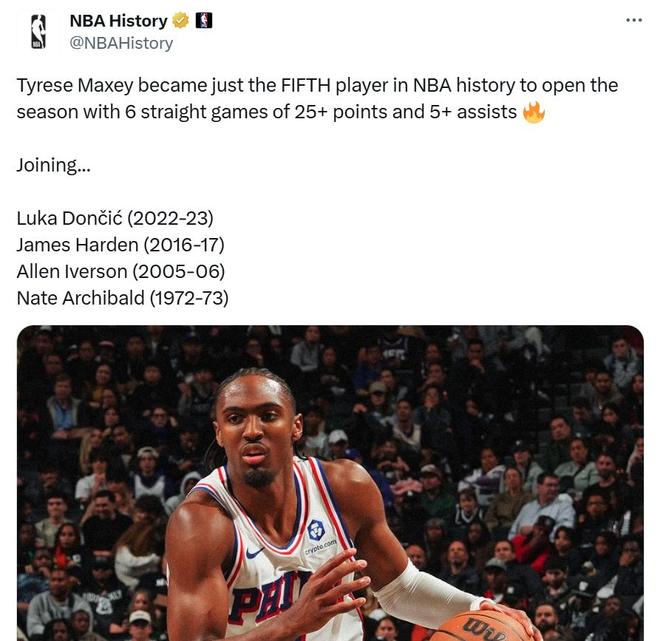 马克西破纪录好在恩比德的缺阵与被罚闹剧丝毫没有影响到76人队,球队反而在恩比德缺席后强势反弹拿下一场大胜,一扫前一场1分憾负的阴霾。其中马克西轻松拿下26+6+7数据,开季前6场连续送出至少25+5助表现,成为NBA历史上第5位交出这一壮举的球员,前四人分别是东契奇(22-23)、哈登(16-17)、艾弗森(05-06)和阿奇博尔德(72-73)。